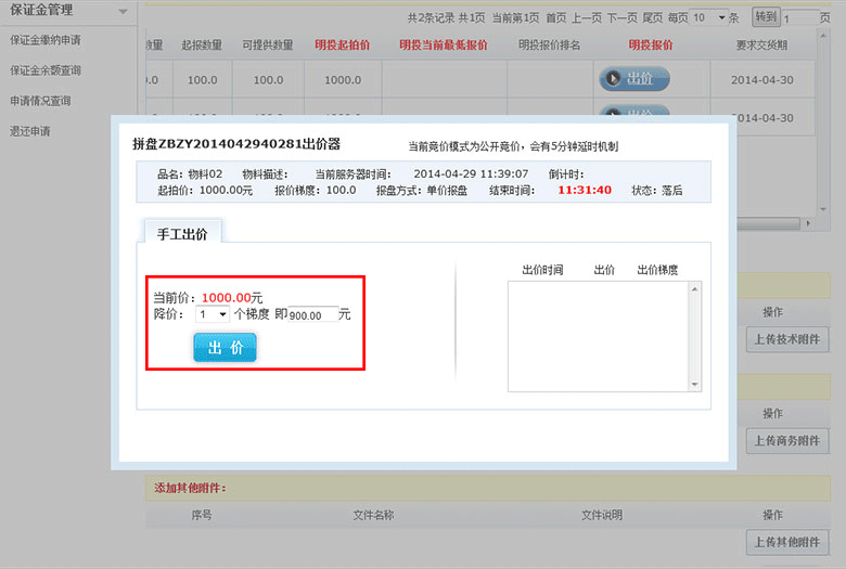 3在弹出的出价器中,选择降价梯度(例:若招标方设置梯度为100元,当前价为1000元,则降低1个梯度后出价为900元),点击出价。