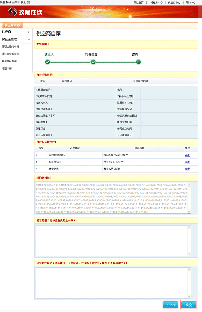 1进入“供应商中心—供应商自荐”,选择采购组织,点击下一步
